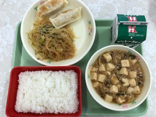 今日の給食の献立は ごはん 牛乳 餃子 バンサンスー 麻婆豆腐 です。 カロリーは、843㎉です。