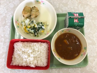 今日の給食の献立は 麦ごはん 牛乳 ハヤシシチュー 枝豆フリッター コーンサラダ です。 カロリーは、863㎉です。