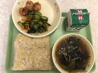 醤油ラーメン(中華麺、醤油ラーメンスープ) 牛乳 揚げしゅうまい 中華風ごま酢あえ です。