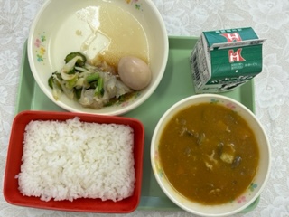 ごはん 牛乳 夏野菜カレー 煮卵 こんにゃくサラダ です。