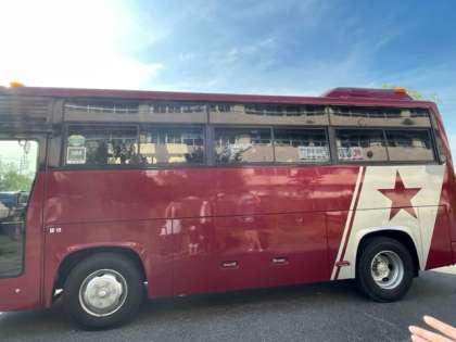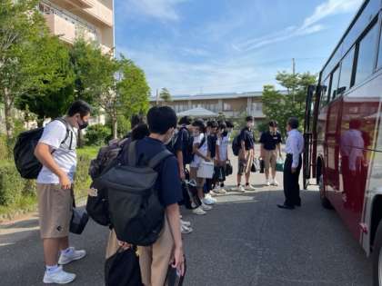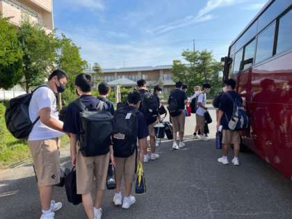 バスケットボール男子が県大会最終日に出発しました。決勝リーグが行われます。頑張れ、藤代中。