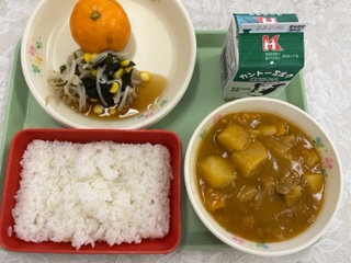 今日の給食は ごはん 牛乳 ポークカレー 海藻サラダ 冷凍みかん です。 カロリーは、807㎉です。