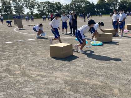 練習頑張っています。カードに何が書いてあるかな。縄跳び、箱、浮き輪を運んでいます。