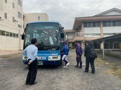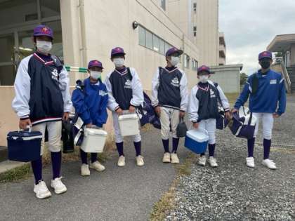 野球部が県南大会に出発しました。光と風の丘公園で行われます。がんばれ藤代中。