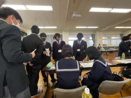 通学路に関する小中高合同座談会 公開日 2022/12/23 更新日 2022/12/23 学校行事 藤代紫水高校にて、通学路に関する小中高合同座談会が行われました。通学路の安全対策について、暫定歩道についてルール作りをしました。学校からは、生徒会役員が参加し、積極的に意見交換を行いました。