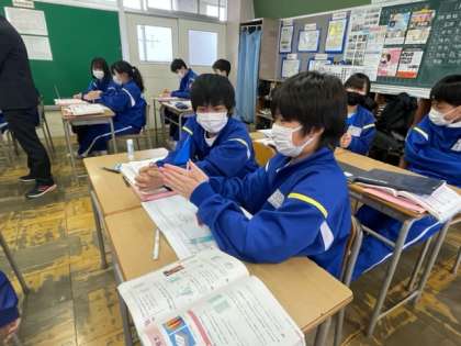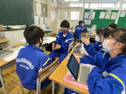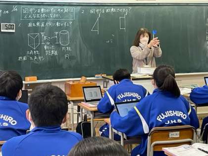 1年生の数学科のいつでも授業参観の様子です。図形を動かすと、その跡どんな立体になるのかを考えます。