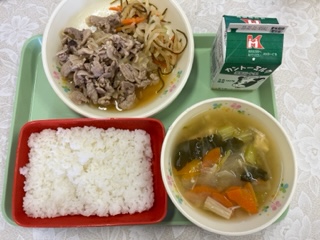 今日の給食の献立は ごはん 牛乳 豚肉の生姜炒め 昆布和え こまつなの味噌汁 です。 カロリーは、755㎉です。