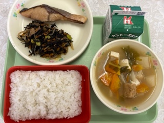 今日の給食の献立は ごはん 牛乳 ぶりの照り焼き ひじきの炒め煮 かぶの味噌汁 です。 カロリーは、821㎉です。