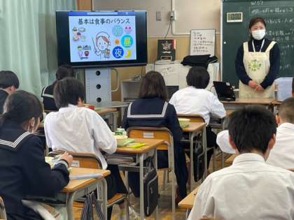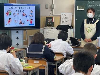 今日の藤代中 給食指導 公開日 2023/02/20 更新日 2023/02/20 学校行事 栄養教諭による給食指導が行われました。スポーツと栄養について学びました。栄養バランスや試合前日に気をつけることなど教えてもらいました。