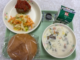 ハンバーガー(切り目入り丸パン ハンバーグトマトソースかけ) 牛乳 コールスロー コーンチャウダー プルーン です。