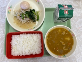今日の給食の献立は ごはん 牛乳 ポークカレー 煮卵 もやしサラダ(ドレッシング) です。 カロリーは、849㎉です。