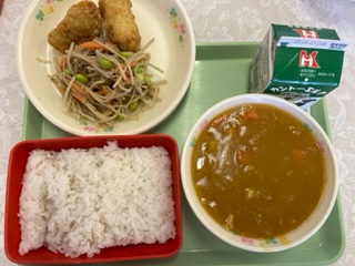 今日の給食の献立は 麦ごはん 牛乳 チキンカレー フリッター ごぼうサラダ です。 カロリーは、929㎉です。