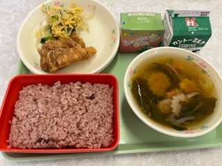 今日の給食 公開日 2023/03/10 更新日 2023/03/10 学校行事 今日の給食の献立は 卒業お祝い献立 です。 中学3年生は義務教育最後の給食になります。 赤飯 ごま塩 牛乳 鶏肉のレモン醤油かけ 小松菜と卵の和え物 すまし汁 お祝いケーキ です。 カロリーは、974㎉です。