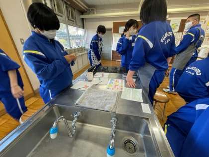 2年生の家庭科では、毛糸を染色しています。お世話になった方にしおりを作ります。