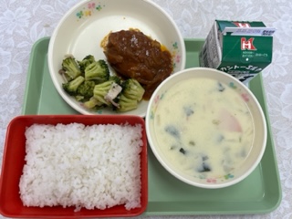 ごはん 牛乳 ハンバーグカレーソース ブロッコリーのガーリックソテー ほうれん草のクリームスープ です。