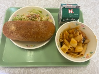 今日の給食の献立は あげぱん(きなこ) 牛乳 チキンとペンネのトマト煮 ツナサラダ です。 カロリーは、830㎉です。