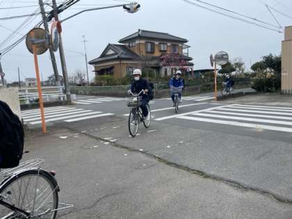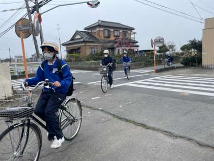 朝の登校の様子です。お天気は良くないですが、元気に登校しています。桜も咲き始めました。