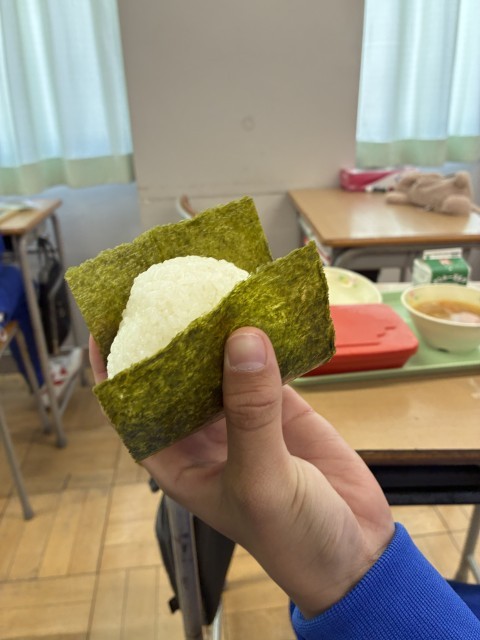 自分でおにぎりを握って海苔で包み、マイおにぎりを作って美味しそうに食べていました。