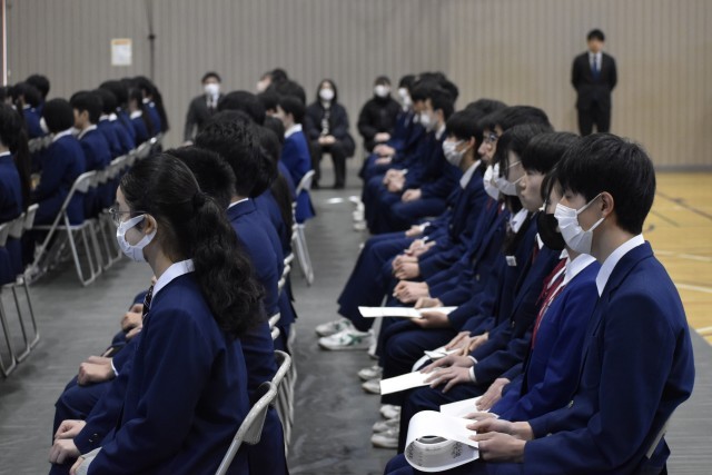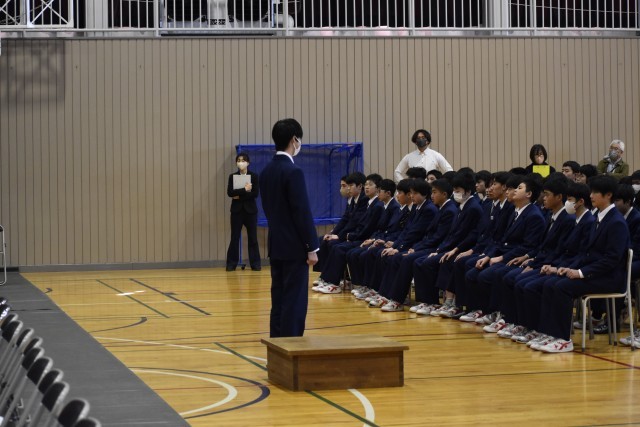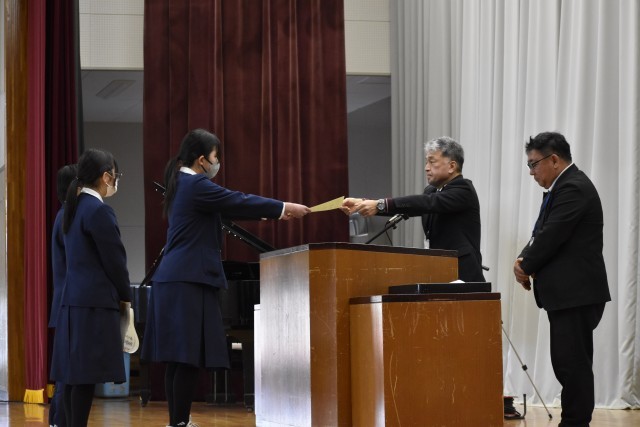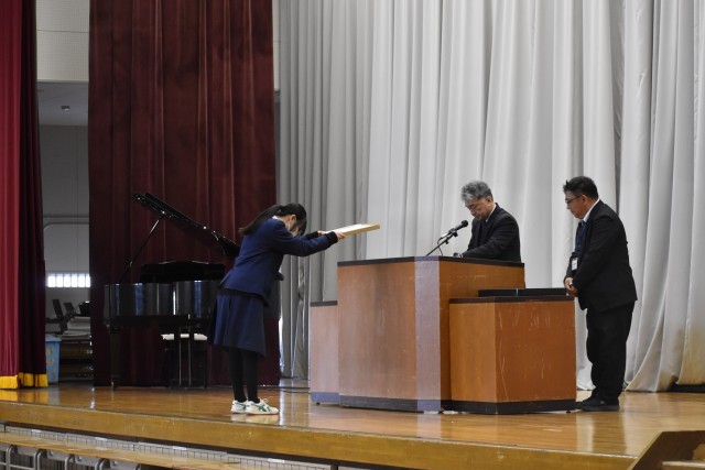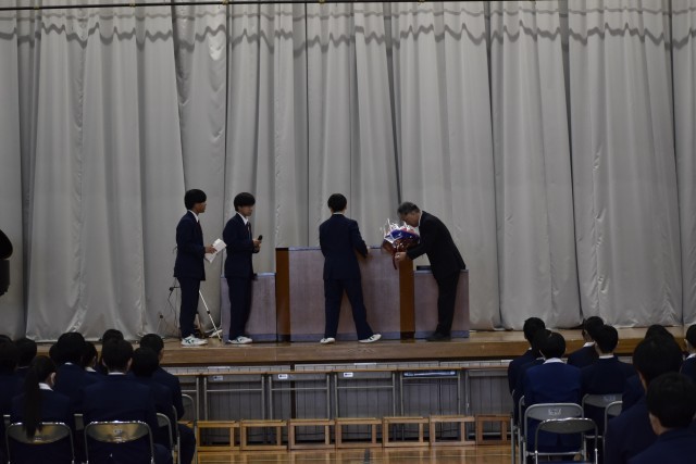 卒業式予行練習と表彰式を行いました。予行練習では、本番さながらの緊張感の中、一つ一つの動きを確認しました。3年生の真剣な姿からは、卒業に向けた強い思いが伝わってきました。続いて行われた表彰式では、これまでの努力と成果を称え、多くの生徒が表彰されました。さらに今年度で最後となる校長先生へ、生徒からサプライズで感謝状と花束の贈呈がありました。会場は大きな拍手に包まれ、感謝の思いがあふれれる心温まる時間となりました。