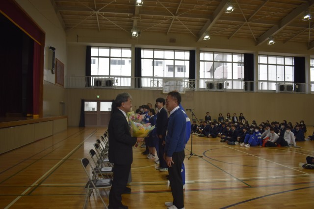 本日体育館にて「転退職員とのお別れ会」を実施しました。これまで本校の教育活動にご尽力いただいた先生方とのお別れの場となり、生徒たちは感謝の気持ちを込めて見送りました。先生方から暖かいメッセージに、これまでの日々を振り返りながら、別れの寂しさと新たな門出への応援の気持ちが広がる式となりました。