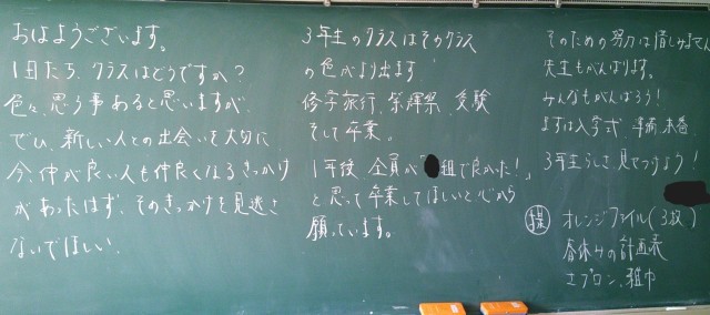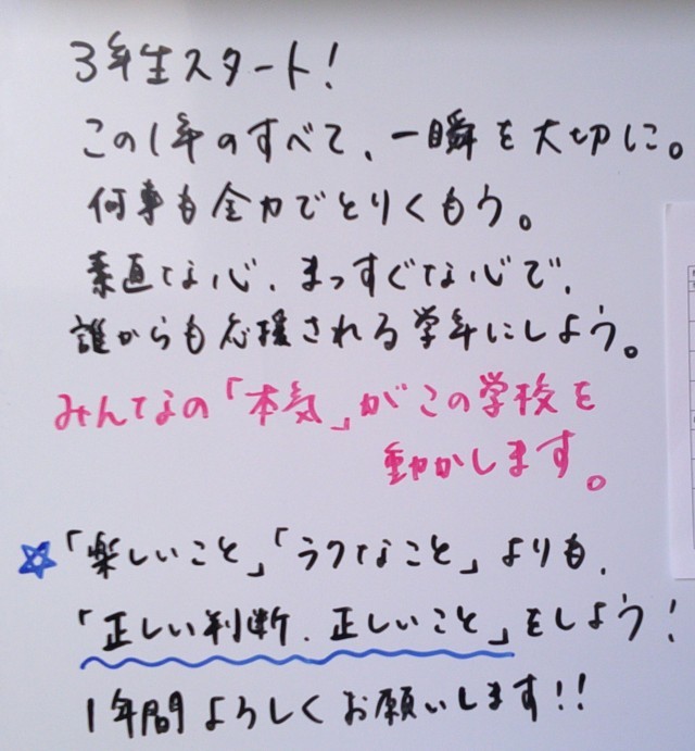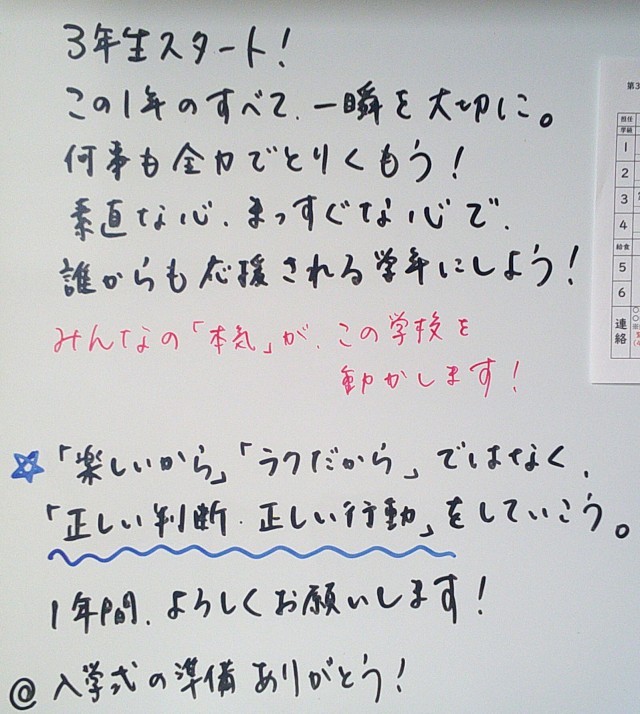 教室や廊下を覗くと、学年主任や担任の想いが綴ってありました。