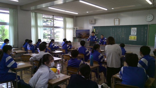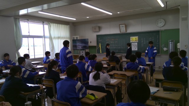 みんなで意見を出し合い、中学校最後の一年、クラス全員で目指すゴールを言葉に表します。学級委員が司会と書記をつとめて、和気あいあい話合い活動をしていました。校訓「かしこく やさしく たくましく」学年目標「超戦…これまでの自分(たち)を超える、何事も全力で挑戦する」生徒会スローガン「団結 創発 挑戦」にのっとって、自分の考えを発表し、グループ、クラスで一つの考えにまとめました。さすが最高学年です。