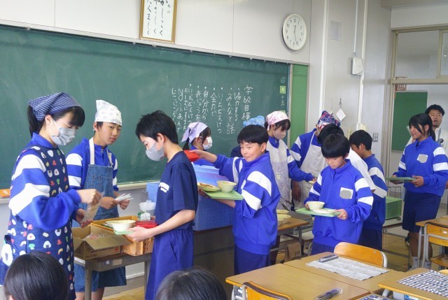 授業終了後、10分以内に配膳が始まっています。