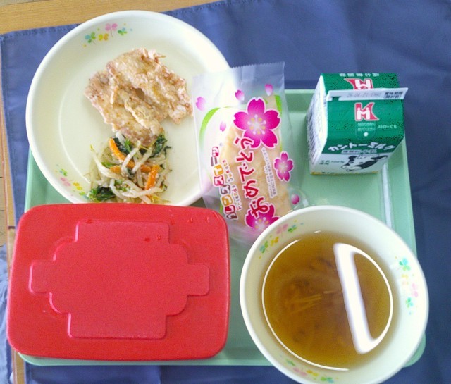 メニューは、鶏肉の塩から揚げ・ほうれん草のごま和え・すまし汁・ご飯・牛乳・いちごクレープです。