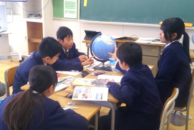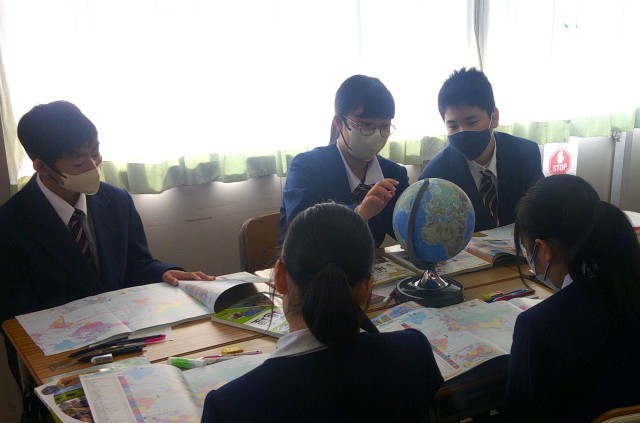 について、地球儀や資料を活用しながらグループで確認しています。
