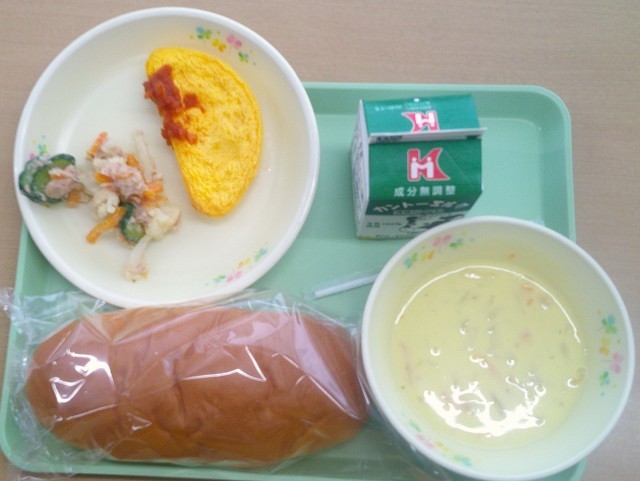 今日は、オムレツのトマトソースがけ・ツナサラダ・コーンクリームスープ・ミルクパン・牛乳です。