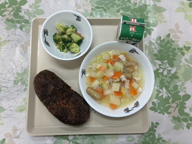 本日のメニューは、ココア揚げパン、牛乳、ポトフ、ブロッコリーのガーリックソテーでした。揚げパンは、程よい揚げ具合とココアと砂糖がよく合い、おいしかったです。ポトフも具だくさんで食べ応えがありました。ごちそうさまでした。