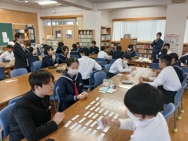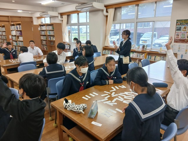 2年生の国語の時間です。今まで学習した動詞の活用についてのまとめでカルタ大会を行いました。楽しそうに活動していました。