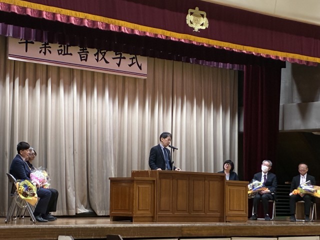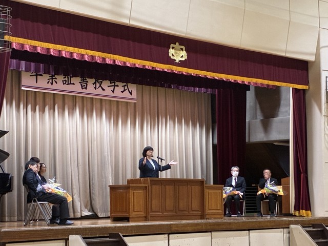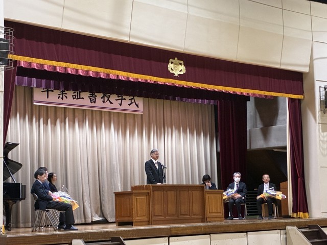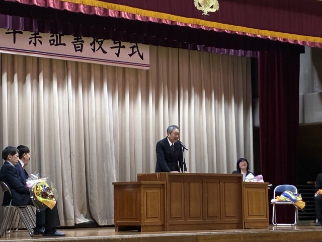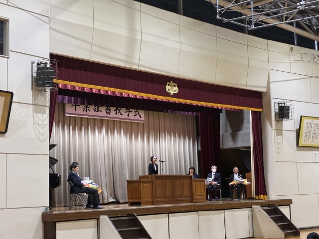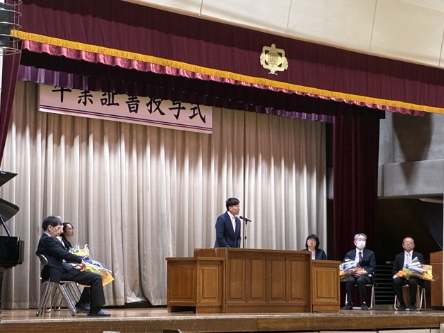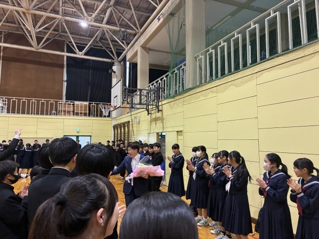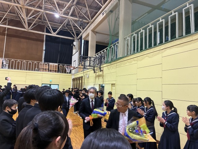 本日、本校では離任式を行いました。これまでお世話になった先生方から、生徒へ温かいメッセージが送られました。生徒代表が感謝の言葉を伝え、花束を贈りました。先生方のこれまでのご尽力に感謝するとともに、新天地での活躍をお祈りしています。今までありがとうございました。
