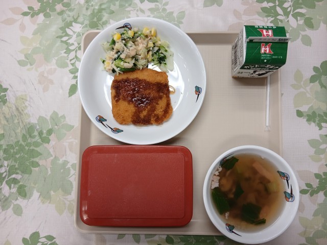 本日のメニューは、ご飯、牛乳、ハムチーズフライ、ほうれん草のサラダ、れんこんのガーリックスープでした。ハムチーズフライは、大きくて食べ応えがあり、ご飯が進みました。スープは、れんこんやベーコン、八宝菜...