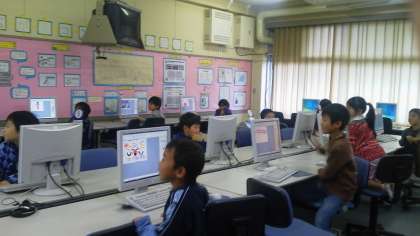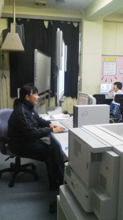 自分の作った作品を、誰よりも先に先生に見て欲しい「先生大好き」な1,2年生の声がパソコン教室に響き、先生は大忙し。