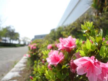 写真は,教育委員会前のツツジ。(うしろの建物が教委)