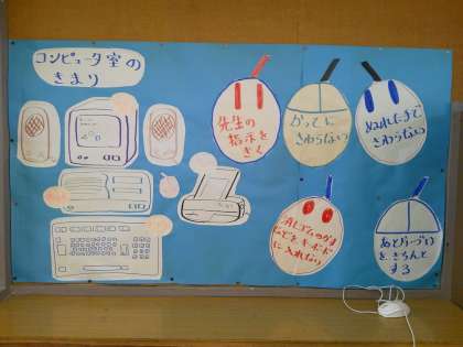 最初に担任の先生が「コンピュータ室のきまり」について説明した後,ジャストスマイルのマウス練習「カチカチ忍法」で、マウスのクリック、ダブルクリック、ドラッグを楽しく練習しました。