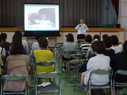 【写真左】市内小学校保護者対象の情報モラル講話の様子