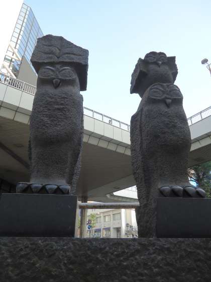 【写真中】駅西口に降りてすぐのところに,この像があります。タイトルは「梟家族」です。