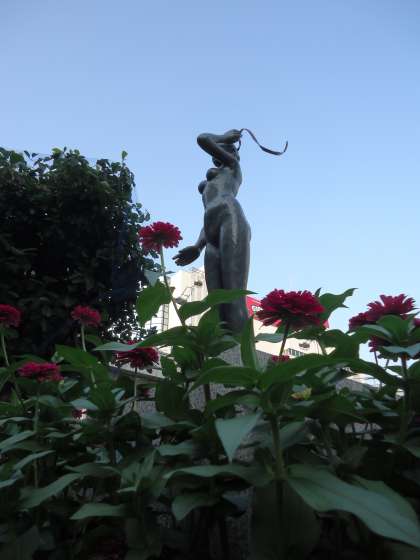 【写真下】駅西口のロータリー中央部に,この像があります。タイトルは「和」(NAGOMI)です。