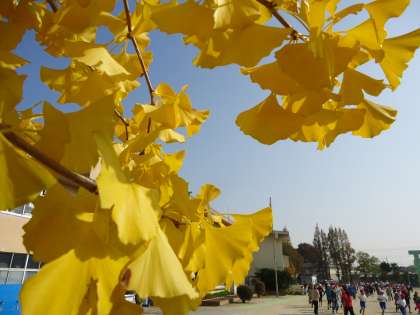 「イチョウの葉の黄色と空の青のコントラストがきれい。」