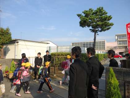 【写真】中学生が母校の小学校を訪れての登校時の挨拶のようす