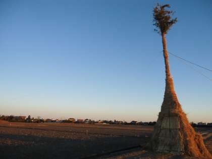 写真のように,竹と藁で組んだものを立て,ロープで固定し,当日はこれに火を点けて,しめ縄などの正月飾りを燃やすものです。