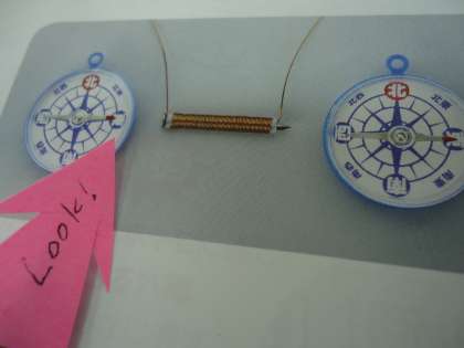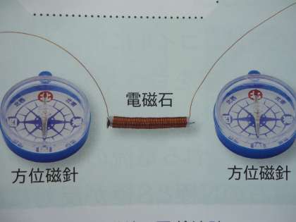 【写真上】模範図で「方位磁針と電磁石。どの向きに置いていますか?」と問う。