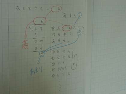 よさ2 あまり3を,同色(青)で結びつけておさえています。