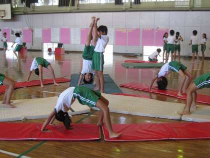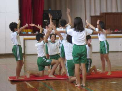 自分のできる技を生かして、グループで集団演技を行います。「1、2、3、・・・」と声を出しながらタイミングを合わせてみんなで演技を行います。演技は、グループごとにビデオカメラで撮影し、後で演技の様子をビデオを見て確認しました。