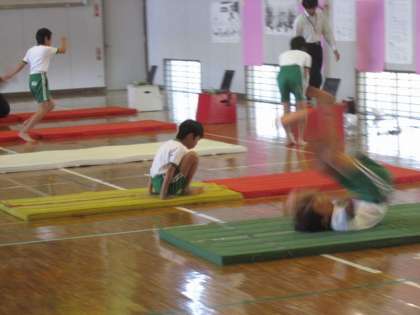 今日のめあては、「できそうな技に挑戦しよう」と、「できる技を生かして、集団演技をしよう」です。