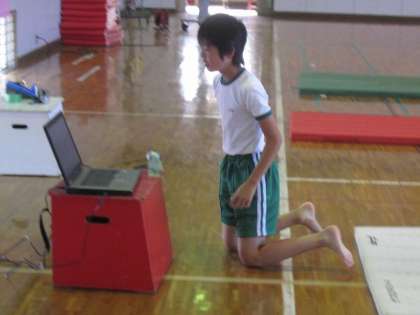 開脚前転、開脚後転、伸膝後転、後転倒立、側方倒立回転、倒立前転などたくさんの技の中から「少し苦手かなぁ」といった技を中心に練習していました。技を行った後、スポーツミラー(遅延時間 6秒)の自分が技を行っている動画を見て「もっと上手に回れるかなあ!」と、繰り返しチャレンジしていました。