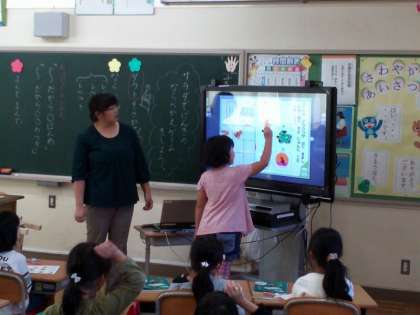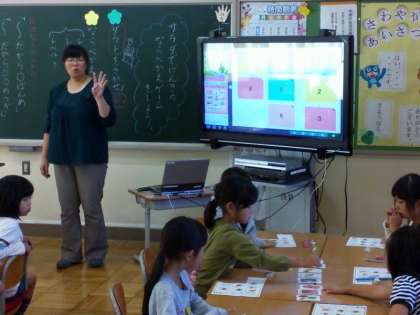 デジタル教科書のサラダでげんきの教材を活用して挿絵を登場順にならべるときには、デジタルテレビのタッチパネル機能を使って児童に動かしてもらいました。これには、「わたしもやりたい!」と、たくさんの手があがりました。