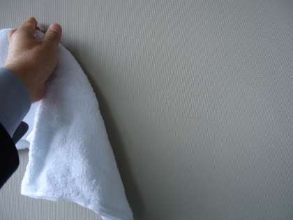 4月、体育館で、初めての体育授業をする際は、写真のように、布で壁をさわり、突起物が無いかどうか確認すると良いです。